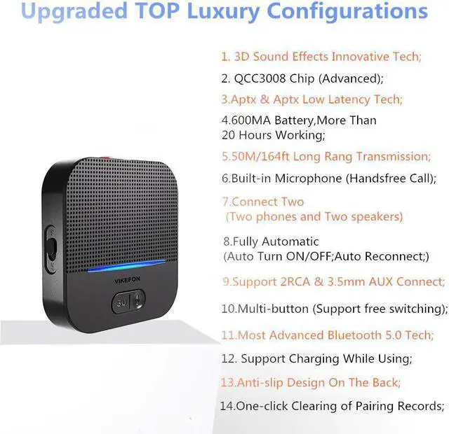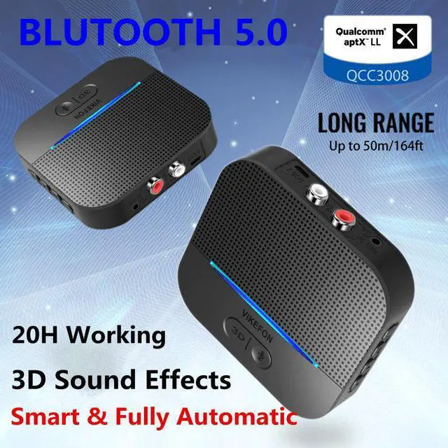 50M(164FT) Long Range for Bluetooth Music Streaming: The Bluetooth audio receiver uses the most innovative Bluetooth technology. It implements QCC3008 Bluetooth 5.0 protocol and the APT-X Low Latency technology that delivers the most sound quality. And it can achieve a range of up to 164ft (50m) line-of-sight in open air and up to 50-70ft (20-30m) indoors.