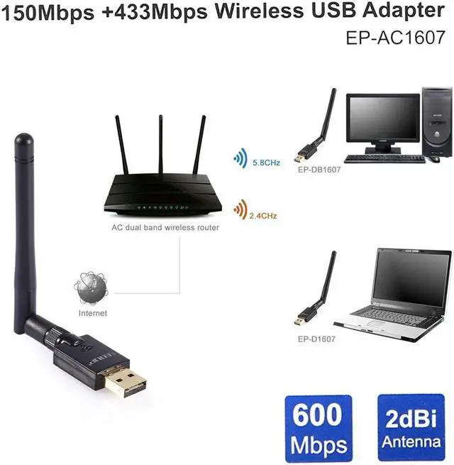 600Mbps 5GHz Dual Band Wireless Adapter,Support 2.4GHz & 5.8GHz WLAN Networks, Delivers Powerful Wireless AC Technology to Your Desktop or Notebook Computer.