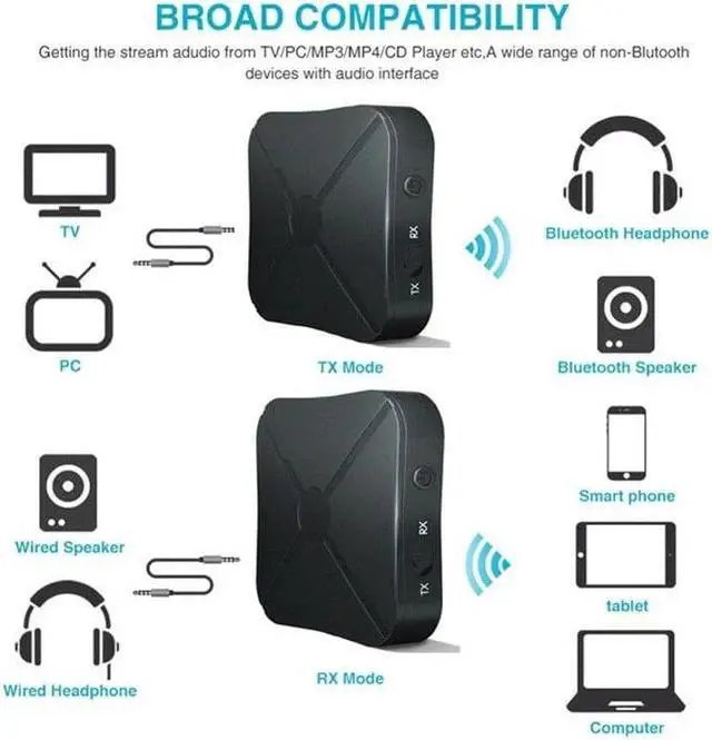 streams audio from your non-Bluetooth TV, home stereo system, or CD