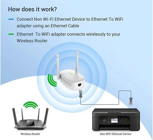 Ethernet adapter: using this wifi network switches your wireless ethernet can connect to a wired device with wifi bridge. The non-wifi device can get fast ethernet connection. Wireless to ethernet adapter for ethernet device: with RJ45 ethernet port this Wifi ethernet bridge can works any Lan-only device like printer smart TV Smart TV Visual doorbell Game Console Ethernet switch desktop laptop PC PS4 Xbox etc.