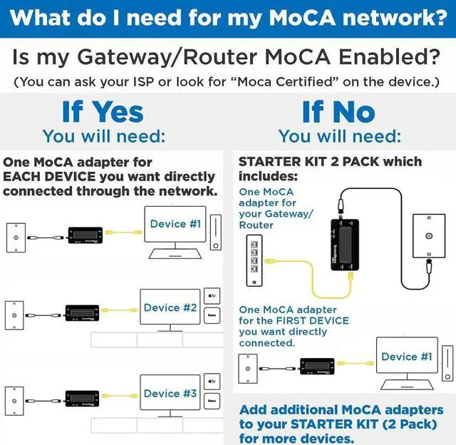 MOCA CAPABILITY - Most routers need a MoCA adapter to connect to the router and a second MoCA adaptor to connect to any additional device (see the starter kits). Select routers have built in MoCA capabilities, and those only require one MoCA per additional device. Check with your provider before purchase.