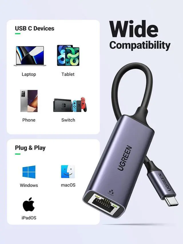 Plug and Play: UGREEN USB C to Lan Adapter is driver-free for Windows 11/10/ 8.1 /8, macOS, iPad OS, Chrome OS, and Android Systems. Just plug in and enjoy a smooth wired network.