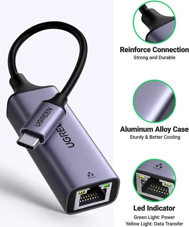 1000Mbps Hyper Speed: UGREEN Gigabit USB-C to Ethernet Adapter can reach up to 1000Mbps data transfer speed, giving a full play to the performance of your network and ensuring stable network speed for you to online working, meeting, classing, gaming, HD video streaming, upload, download, and more.