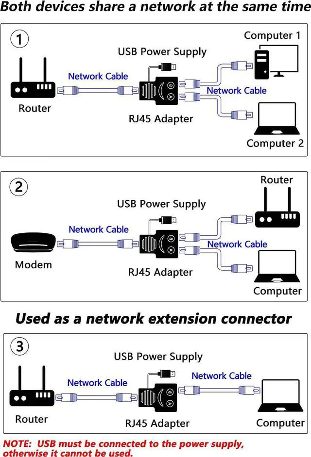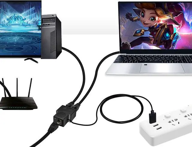 1 IN 2 OUT - Single RJ45 port connects to your router/IPTV, the other 2 RJ45 ports connects to your PC/Laptop/TV/set-top box, and USB Power Cable connects to wall charger. Two computers can simultaneously surf the Internet through the same router network interface.