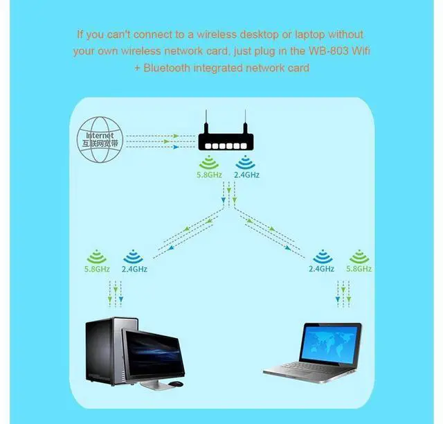 Wireless WIFI+Bluetooth two-in-one adapter, in line with IEEE802.11AC, IEEE802.11B, IEEE802.11G, IEEE802.11N wireless transmission standards, using standard wireless ACC empty channel detection technology, when there is interference from wireless models around, avoid channel interference , Make the wireless signal more stable. When the interference disappears, the idle channels can be automatically bundled to make full use of the advantages of bundling and improve wireless performance.