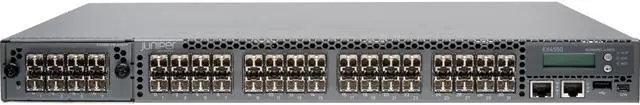 Featuring up to 48 wire-speed 1GbE or 10GbE small form-factor pluggable transceiver (SFP/SFP+) or 100M/1GBASE-T/10GBASE-T ports in a compact one rack unit (1 U) platform, the Juniper Networks® EX4550 Ethernet Switch delivers 480 Gbps of Layer 2 and Layer 3 connectivity to networked devices such as servers and other switches. Two versions of the EX4550 base switch are available: a 32-port fiber-based version that provides 32 fixed 10GbE SFP/SFP+ pluggable ports, and a 32-port copper-based* version that supports 32 fixed 100M/1GBASE-T/10GBASE-T ports.
