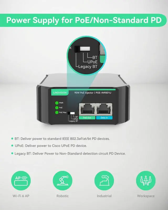 Convert single ethernet port to IEEE802.3af/at/bt 90W PoE++ port, supply sufficient PoE power for IP camera, PTZ camera, PoE speaker, AP, etc.