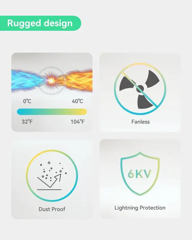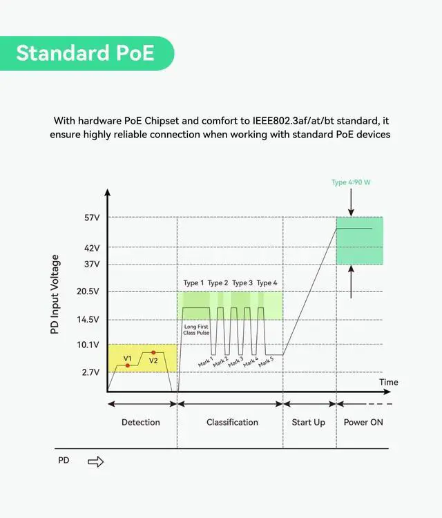 Use hardware IEEE802.3af/at/bt PoE chipset, automatically powers up PD device with 4 steps (PD Detection -> PoE Classification -> Start Up -> Power ON). It allocates appropriate power to IEEE802.af/at/bt PoE devices, and no power for non-PoE devices, ensures high safety for PoE and Non-PoE device
