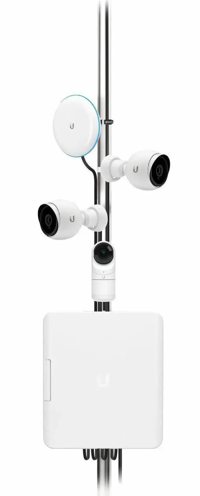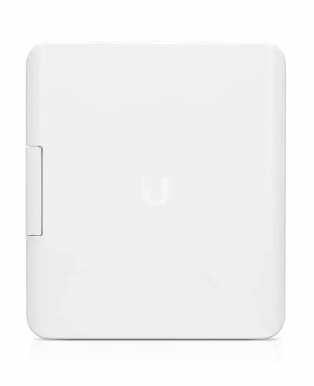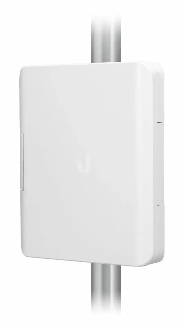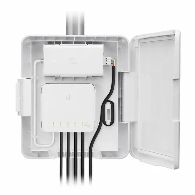 The USW Flex Utility is an outdoor weatherproof enclosure designed for use with the UniFi Switch Flex, USW-Flex. It includes an Ethernet patch cable and a 60W PoE adapter, which provides a maximum PoE budget of 46W. The USW Flex Utility can be easily mounted on a pole, provides clean cable management and screw lock for security.