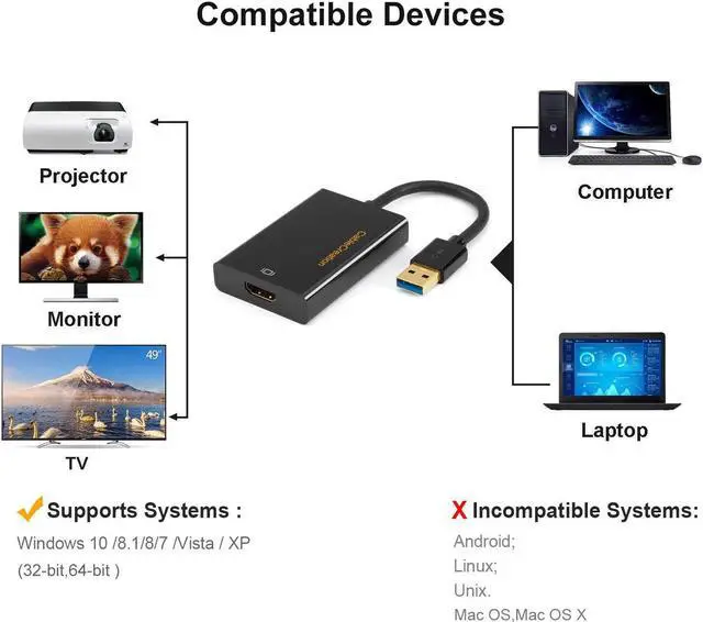 ?Connectivity: USB 3.0 is input, HDMI is output. USB 3 to HDMI converter allows you to connect your desktop PC or laptop's USB port to an extra HDMI monitor, projector or TV, you can make a presentation, watch videos or slide shows on the big screen. NOTES: only compatible with Windows 10 / 8.1 / 8 / 7, Vista, XP (32-bit / 64-bit).