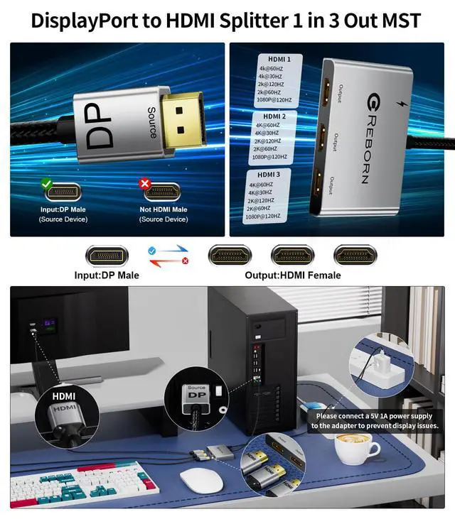 Plug and Play SolutionThe HDMI Splitter 1 in 3 out is super easy to use. It's plug-and-play, so no need to install drivers, saving you time. You can quickly expand to 1, 2, or 3 monitors. Here's how: Plug the DP connector into your signal source like a PC or graphics card. Then, connect the provided power cable to get 5V/1A current. Finally, use HDMI extension cables that support 4K@60Hz to link the 3 HDMI female connectors to your monitors. *Note: PCs with integrated GPUs usually only support mirroring mode or can only extend one monitor