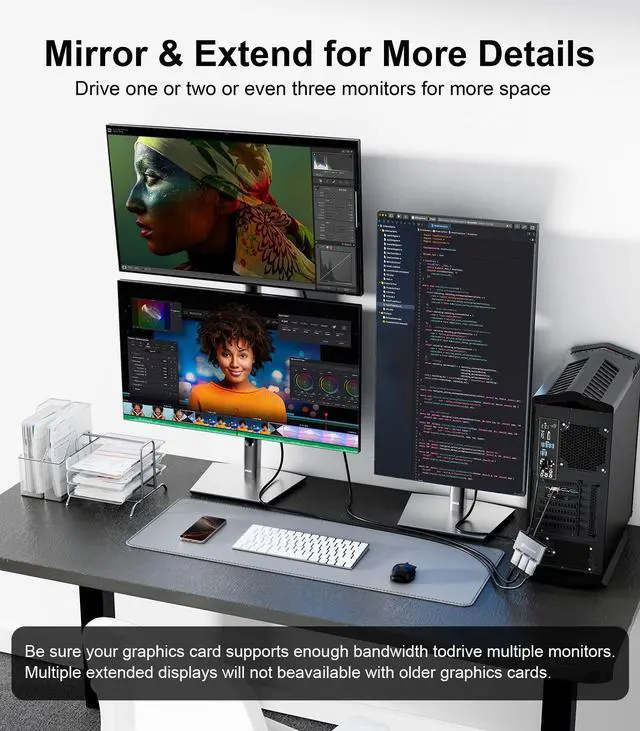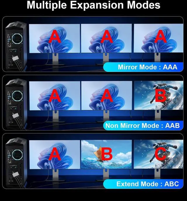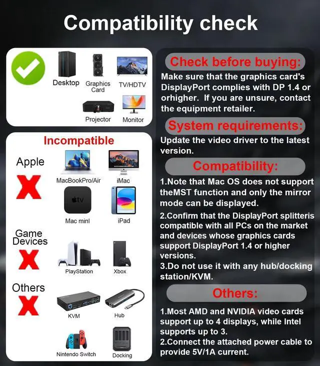 Multi-Monitor Extended Display This DisplayPort splitter transforms your DP/DP++ port into 3 HDMI outputs, creating an extended desktop for productivity or multi-screen gaming. Supports both mirror mode (SST) and extended mode (MST). *For best results, use with dedicated NVIDIA/AMD graphics cards supporting 18Gbps+ bandwidth. Not compatible with Mac OS systems.