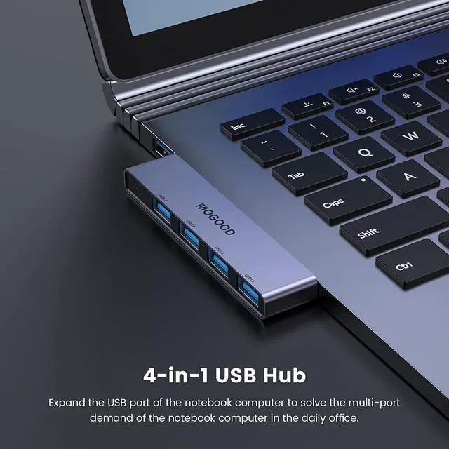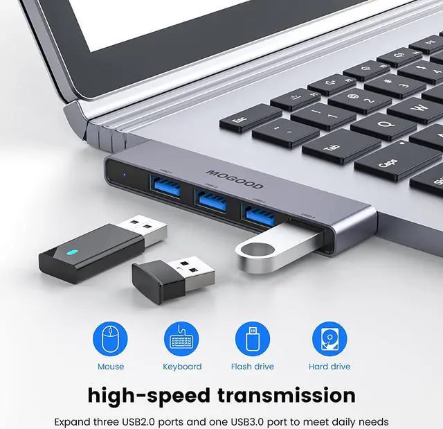 4 in 1 USB HubUSB Hub Multiport Adapter contains 1*USB 3.0 and 3*USB 2.0, supports super faster data transfer up to 5Gbps which is 10X faster than USB 2.0 (480 Mbps), which allows you to transfer datas in just seconds; USB extension hub was built in OTG function chip, it can easily connect the mouse, keyboard, USB disk, and other USB devices