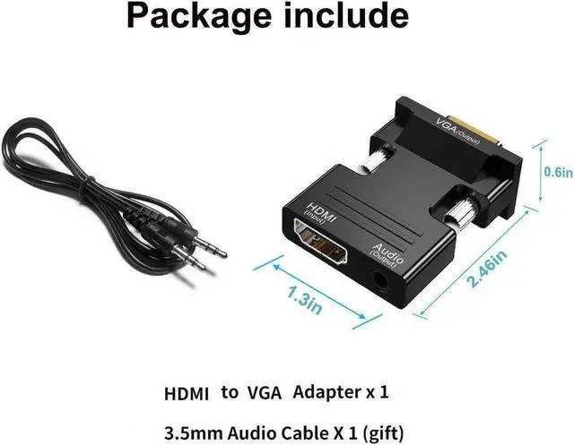 1080P FULL HD ResolutionHDMI-VGA Adapter support resolution 720P/1080i/1080P 3D HDMI V 1.4. Plug & play No any driver or program required. With this HDMI to VGA with audio its easily to create home theater or make presentations at meetings. Audio Video Sync Supported Converts HDMI digital signal to VGA analog signal; 3.5 mm audio port sends audio to speakers or a display( 3.5 mm stereo cable included); power supply interface: Micro USB backup power supply solve the problem that high power device used instability with insufficient power supply. Convenient and convenientPortable HDMI to VGA adapter / converter. Simply connect older computers / notebooks with HDMI output to a TV monitor or projector with VGA input to stream videos play games or share content. Widely compatibledesktop notebook ultrabook notebook projector DVD HDTV media player cable box or other devices with HDMI connection. Plug and play no drivers required no external power supply required. What You'll Get 1x HDMI to VGA adapter / converter &1x 3.5 mm Stereo Cable includedMonths Product Warranty and Lifetime Technical Support backed by 24/h friendly customer service.
