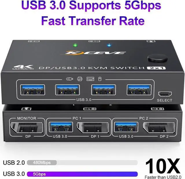 [with 4 USB 3.0 Port] with 4 built-in USB 3.0 port, 2 PC share 1 display and 4 USB 3.0 devices, without having to unplug, identify wireless keyboards, mice, printers and other USB devices safely (do not support Bluetooth mouse). USB 3.0 supports 5Gbps efficiency and is compatible with USB 2.0 / 1.1 devices.