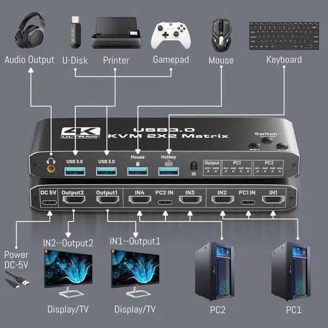 4K HDMI USB KVM Matrix allows you to share one USB keyboard, USB mouse, and two HDMI monitor to control 2 computers, laptops, game consoles.