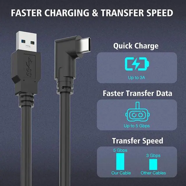 90 Degree Angle - The USB-C side utilizing a 90-degree bend that makes it more suitable for VR headset than a straight connector.
