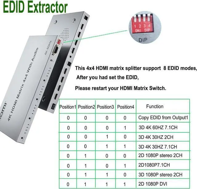 [Audio Split& EDID] With out audio, Supports Dolby TrueHD, DTS-HD, 7.1 ch digital and other HDMI audio formats, EDID learning from connected displays or choose from a wide selection of pre-programmed EDID settings to ensure the correct signal resolution is output from the sources.