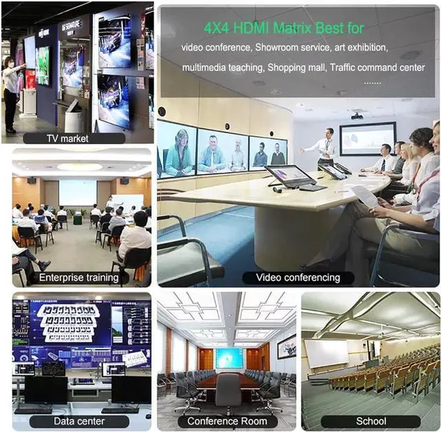 [4K 4x4 HDMI MATRIX] HDMI matrix 4x4 can connect 4 4K UHD signal sources to 4 UHD display terminals with optical fiber and stereo headphone output at the same time via HDMI out 1 port, The matrix allows four HDMI devices to be switched or split easily to 4 HDMIcompatible monitors or projectors.