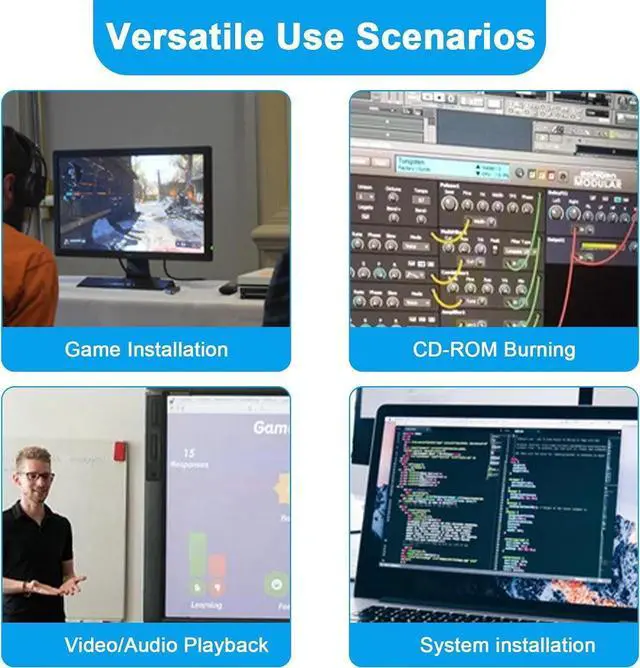 -The external CD/DVD drive boasts USB 3.0 and TYPE-C ports with premium cable cores for rapid data transfer. It achieves up to 24x CD and 8x DVD read/write speeds, boosting efficiency. Quick computer recognition and robust error correction ensure stable performance.