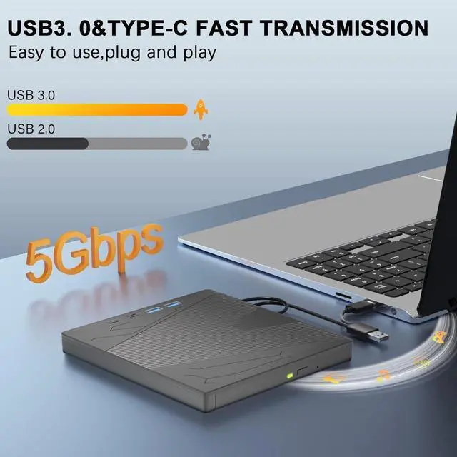 High Speed Data Transmission: with high speed USB 3.0 technology, backward compatible with USB 2.0. USB 3.0 provides higher data transfer rates up to 5 Gigabits/S (625MB/S). It is approximately 10x faster than USB 2.0. Besides that, The cd drive offers Max 8x DVDR Read Speed and Max 24x CD Write/Read speed.