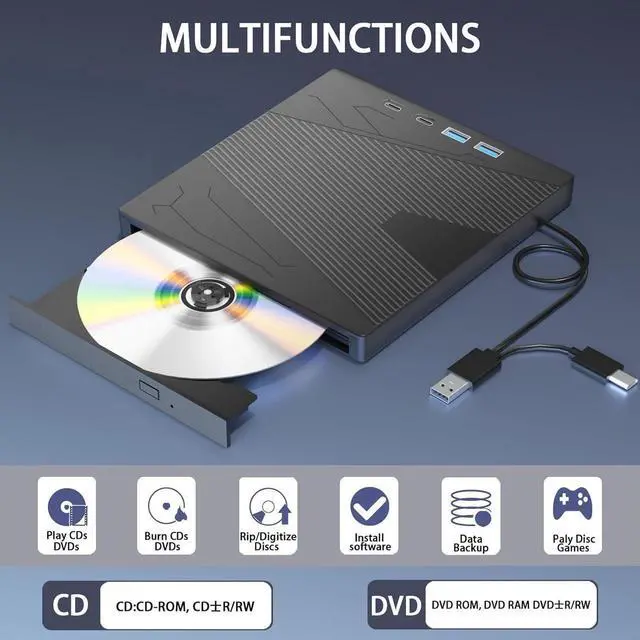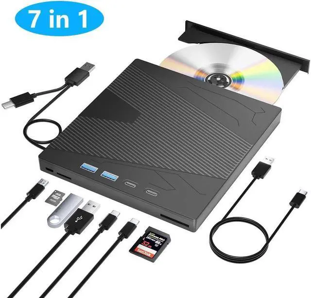 External DVD Drive: Including 1 USB 3.0 port, 1 USB 2.0 port, 2Type C interfaces, 1 TF slot, 1 SD card slot, The external drive can not only read CD DVD, but also can be used as an external laptop