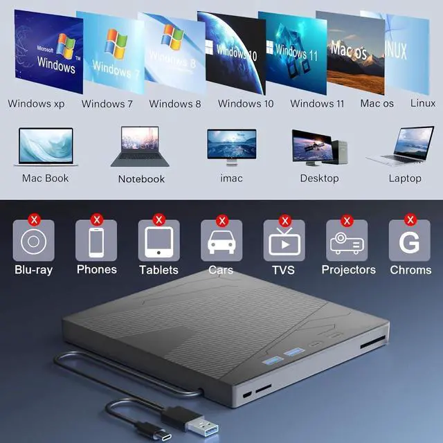 Strong Compatibility: Compatibility Windows 11/10/8/7/XP and Mac OS. Also compatible with reading DVD, CD. Do not Support Smart phone, TV, Car.