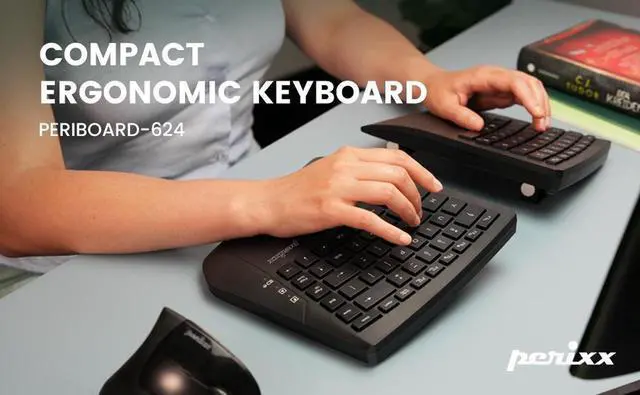 Perixx PERIBOARD-624 is a wireless ergonomic keyboard built with ergonomic principles in mind. The split and the curved design helps you type in a natural and relaxed position. The ideal keyboard to keep you working comfortably all day.