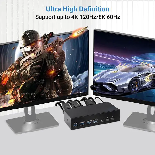 The HDMI DP Dual Monitor KVM Switch allows you to share 4 USB 3.0 devices, 1 HDMI display device and 1 Displayport display device with 2 computers.