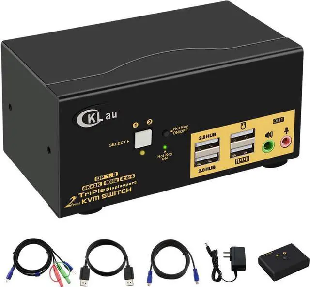 2 Port KVM Switch Triple Monitor DisplayPort 4K @60Hz, 2 Computers x 3 Monitors KVM Switch with Audio and USB 2.0 HUBS DP 1.2 KVM Switch