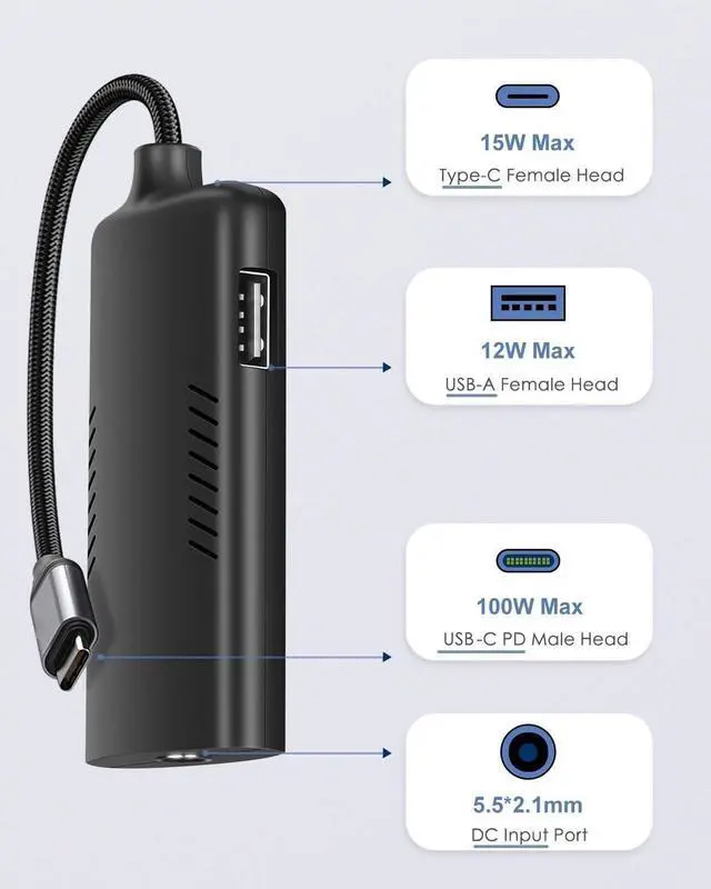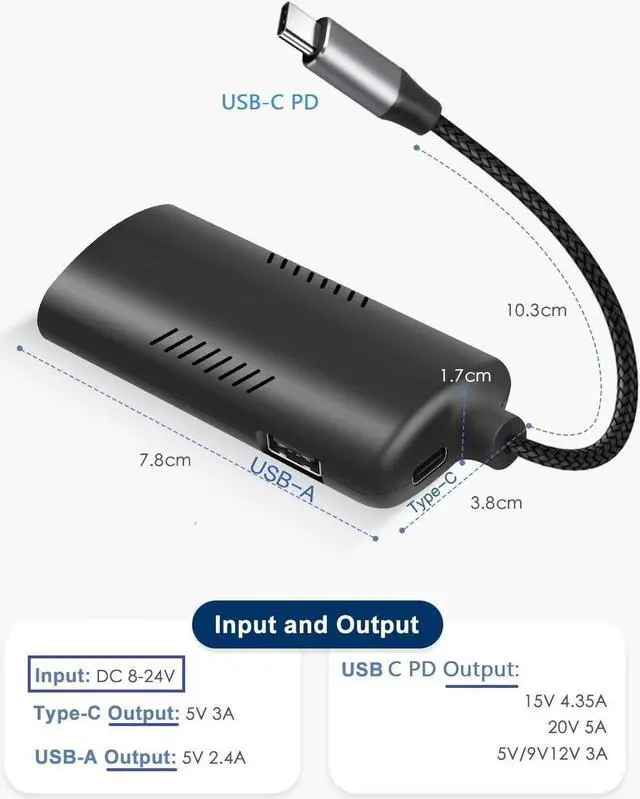 Port Size: 5.5 mm x 2.1 mm/ 2.5 mm ) input, will realize the USB C PD 3.0 100W Type C USB-A Fast Charger, can be used for cell phones, laptops, headphone and others with USB-C port less than 100W. This Type C PD 3.0 Converter with a smart IC, the ouput current and voltage can be adjusted automatically for fast charging and used for 3 devices at the same time.