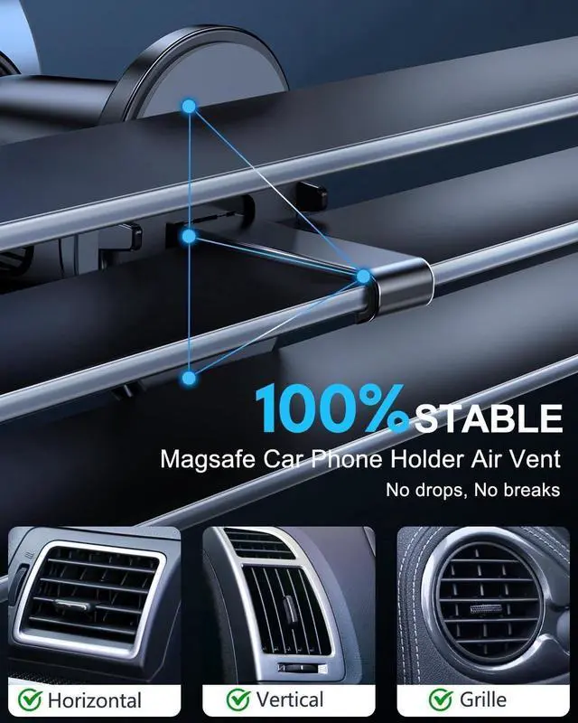 Compatible with Horizontal & Vertical VentsThe steel hook of car phone holder wireless charger is compatible with most horizontal and vertical vents, which solves the common problems of poor compatibility and cradle easy falling off. It can also prevents the aging of hook due to high or low temperatures in the car. (Note: Round vents may not fit)