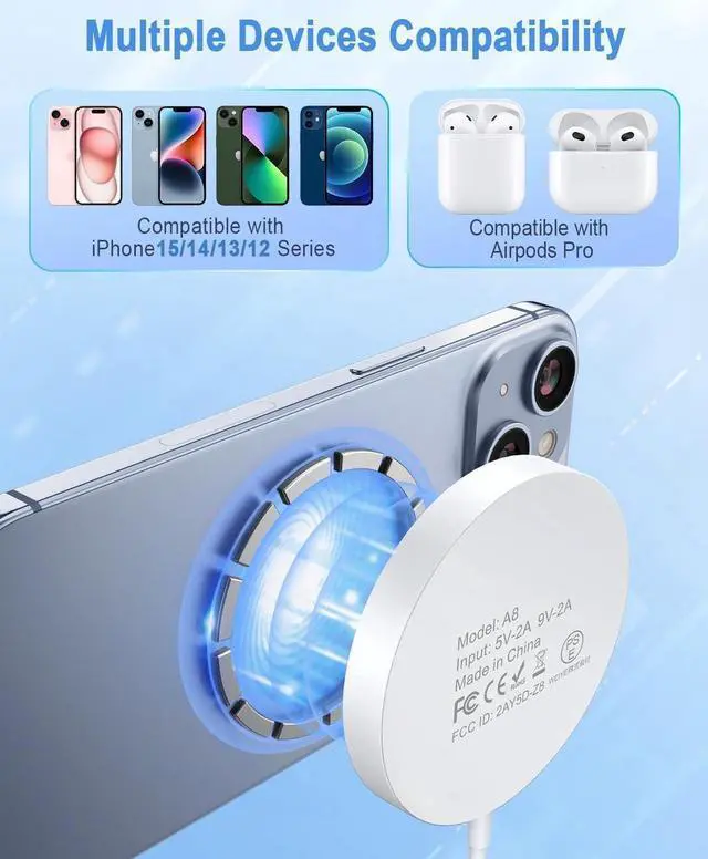 Customized for iPhone 15/14/13/12 Series2024 Newest nano-level quality magnetic wireless charger compatible with the latest iPhone 15 Series and iPhone 14/13/12 series, compatible with Airpods Pro. There is no device compatibility issues after using the upgrade magnet.