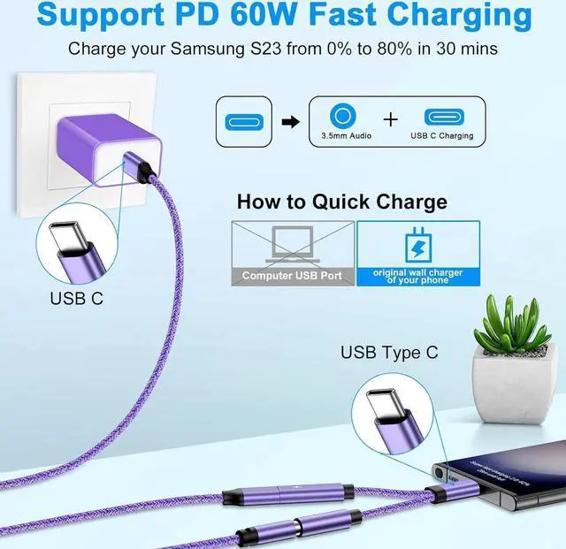 NOTE: usb c splitter audio and charging adapter may not support QC for some new phones. Please use type c wall charger to get super fast charging speed.