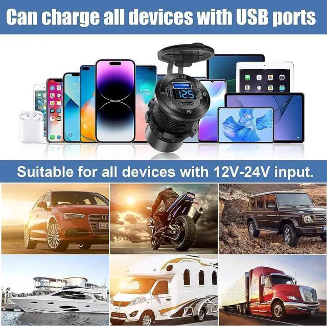 [Wide Compatibility] Suitable for DC 12/24V cars, boats, ships, motorcycles, ATVs, RVs, golf carts, SUVs, etc. This car USB charger is compatible with electronic devices such as iPhones, iPads, Samsung, Android cell phones and tablets, smartwatches, etc.