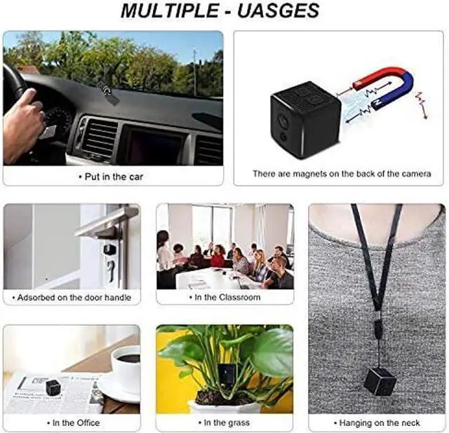 [(Super Mini Hidden Spy Camera)] This mini spy wireless camera is with 1 inch portable cube size and qualified alloy body.Video recording & photo taking.120 degree wide lens.Strong built-in magnet.Innovative swivel mount for 360 degree.This spy camera can be set up in the corner of home,office,store,car,hang around the neck with lanyard or directly in your pocket.This is your best collection as a security camera,body camera,nanny cam,car camcorder, action camera, pet camera, baby camera,cop camera.