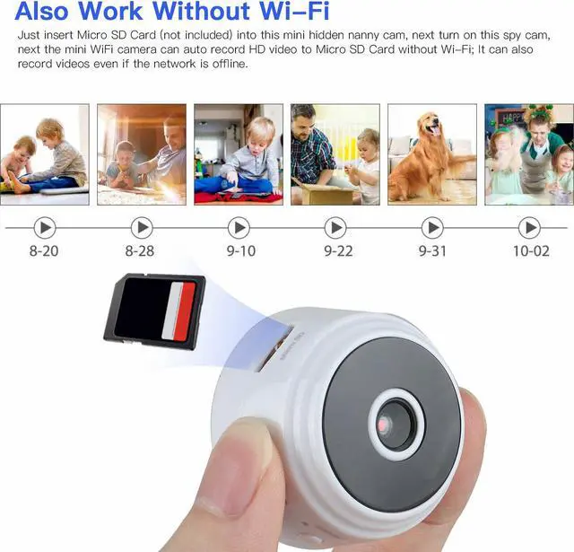 Also Work Without Wi-Fi: Just insert Micro SD Card (not included) into this mini cam, next turn on this cam, next the mini WiFi camera can auto record HD video to Micro SD Card without Wi-Fi; It can also record videos even if the network is offline.