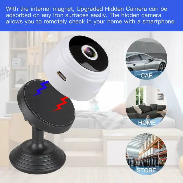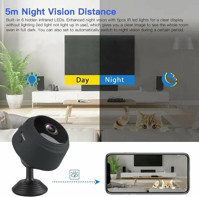 5m Night Vision Distance: Built-in 6 hidden infrared LEDs. Enhanced night vision with 6pcs IR led lights for a clear display without lighting (led light not light up in use), which gives you a clear image to see the whole room even in full dark. You can also set to automatically switch to night vision during a certain period. With the internal magnet, Upgraded Camera can be adsorbed on any iron surfaces easily. The camera allows you to remotely check in your home with a smartphone.