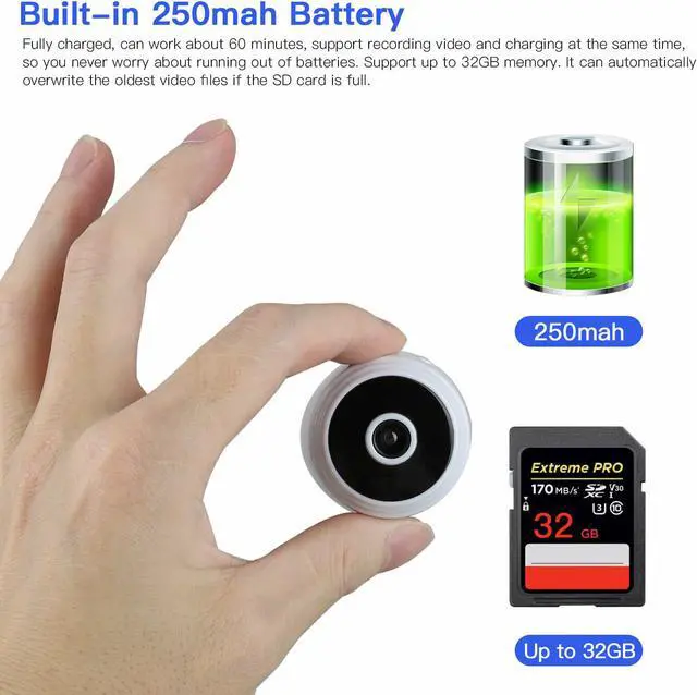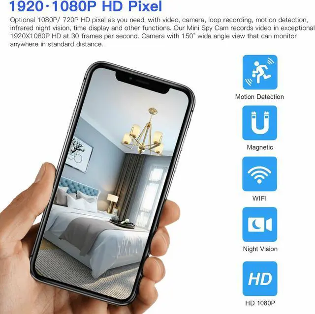 Product Feature1920·1080P HD Pixel: Optional 1080P HD pixel as you need, with video, camera, loop recording, motion detection, infrared night vision, time display and other functions. Our Mini Cam records video in exceptional 1920X1080P HD at 30 frames per second. Camera with 150° wide angle view that can monitor anywhere in standard distance.