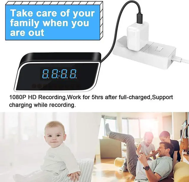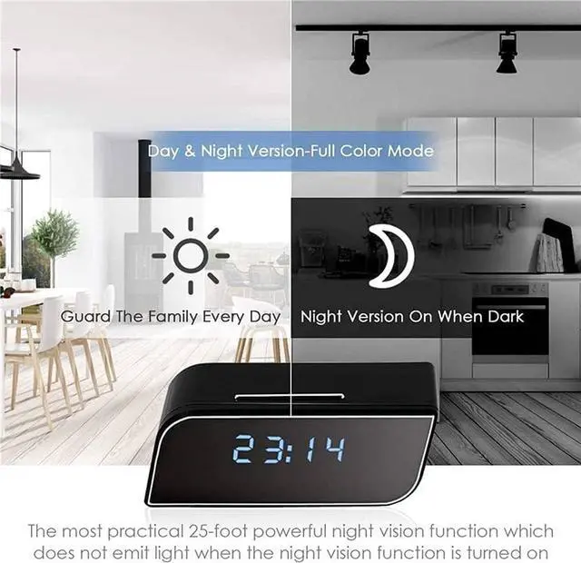 Infrared Night Vision Surveillance Camera Built-in 12 night vision IR lights, you can see faces and some details even in a dark room and no blinking light when recording, Night vision effective range 10 meters. Whether you want to add an extra insurance for protecting your family or you simply need a smart nanny surveillance cam, this hidden camera clock is worthy of the perfect solution.