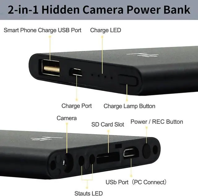Portable Power Bank Disguise: The hidden cam is disguised as a power bank with a capacity of 5000mAh, which can charge your device and act as a hidden camera without anyone noticing.