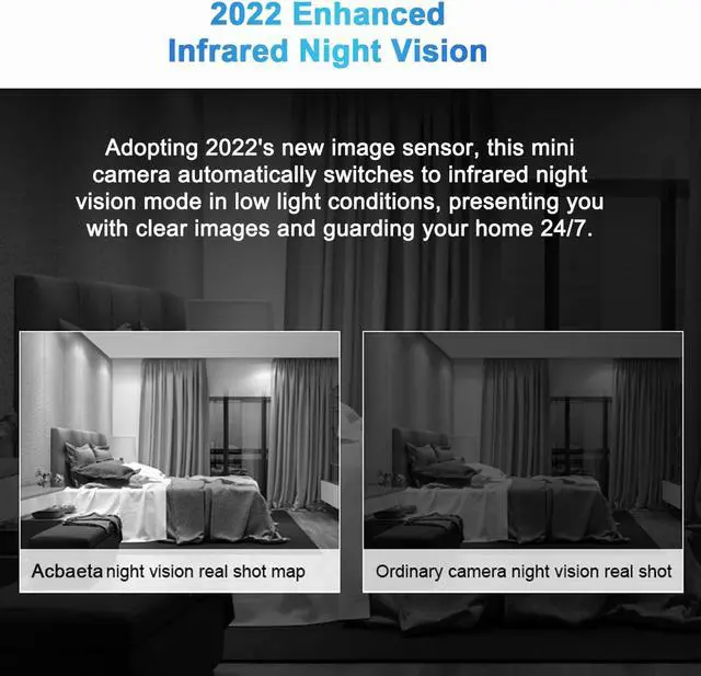 Powerful High Spec Mini Hidden CameraBuilt-in 2023 upgraded spy camera module, this mini camera can take high-definition photos or videos for you at any time. It adopts a mini body design and is easy to hide anywhere. The nanny cam can be carried around with the equipped back clip, or placed in the corner of the home, office, car, courtyard, indoor or outdoor.