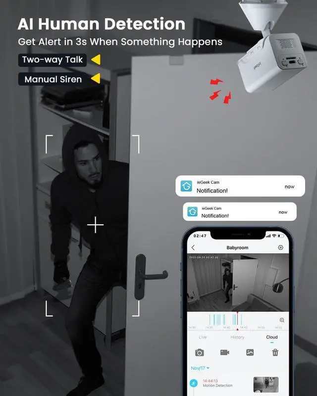 AI Human Detection & Instant NotificationThis indoor camera wireless integrates a PIR sensor with a human shape detection algorithm to make sure it alerts you only when a person is detected, rather than a pet or insects. You also can customize the alarm plan/area/ detection sensitivity(1-10)/ according to your needs. When motion is detected the camera enters to recording state at once, secure your recorded videos on a local micro SD card up to 128GB (not included) or ieGeek Cloud.
