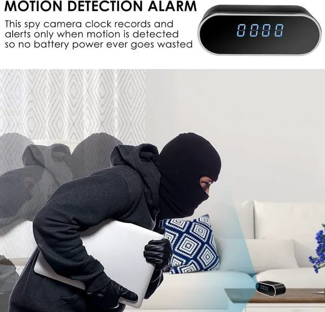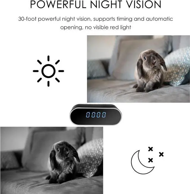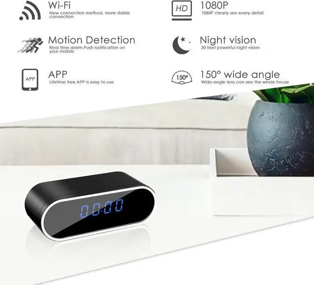 MOTION DETECTION & NIGHT VISIONWhen motion is detected, the wifi hidden camera clock will capture a photo and save in app and push an alarm notification to your phone with photo. The HD 1080P Video and built-in 6 night vision infrared LEDs allows you to see any details and surfaces clearly even in dark night. Please turn on the functions in the APP before using.