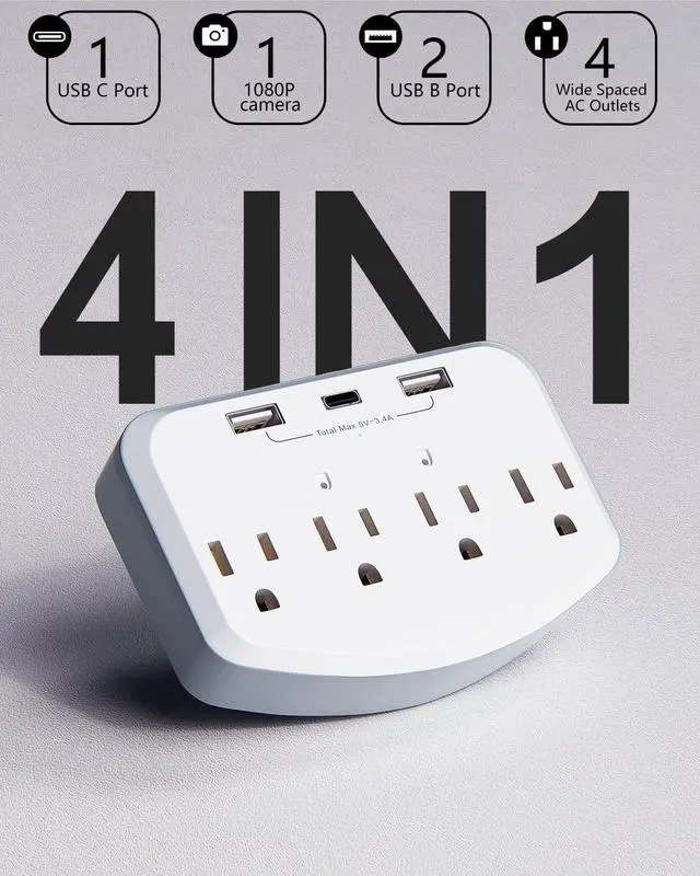 4 IN 1 Function Hidden Camera Fit duplex outlet perfectly, just plug in to use. 3 AC outlet expander (120V, 15A, 1800W ) with 3 USB PD fast charging ports( 3.4A, 20W ), 1700 joules surge protector and a hidden camera. Can be used as a outlet for daily use.