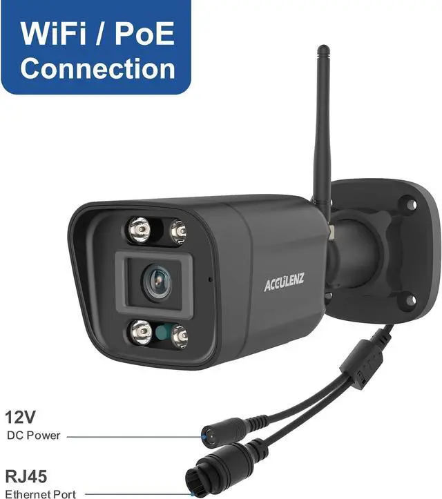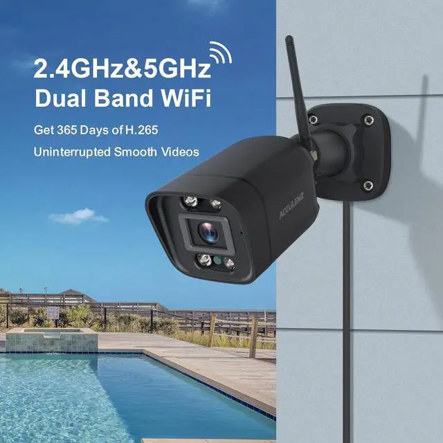 5G/ 2.4GH z Dual-Band WiFiEnjoy the best network video performance with the Acculenz outdoor camera's dual-band WiFi, which offers a longer transmission distance at 2.4GH z and a faster, more stable transmission frame rate at 5GHz. ( )