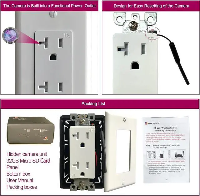 4. The Camera is Professionally Hardwired to a Power Outlet and Powered by AC, It Can Run 24/7 Without Any Unusual Lights and Sounds. It Can Directly Replace the Existing Wall Socket and Use the Full Functionality of the Power Socket As Usual.