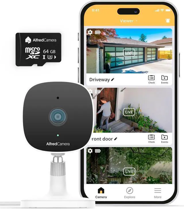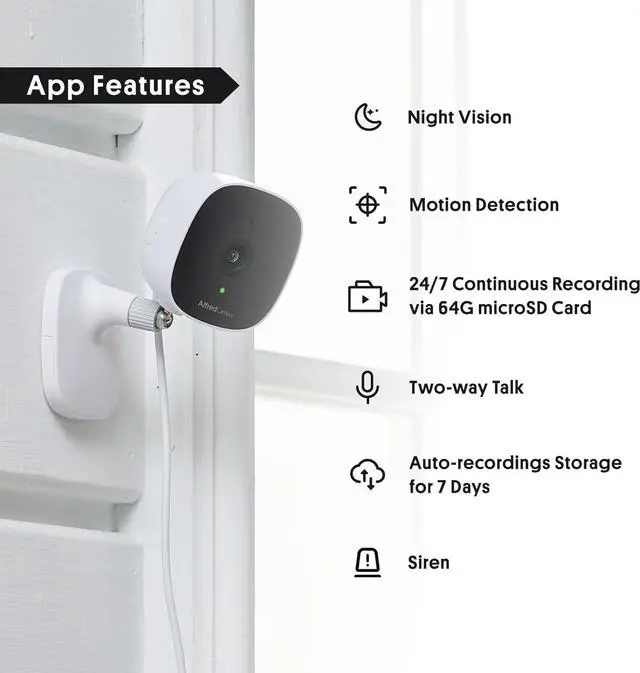 Introducing AlfredCam Plus: Your trusty Alfredcam companion, ready for indoors and outdoors, rain or shine. Featuring IP65 weather resistant, 2K live streaming, color night viewing, 24/7 continuous recording, motion detection, and more we've got you covered. Plus, we've added a 64GB microSD Card and window sticker, just for you. Seamlessly pair this camera with our top-rated security app, offering ad-supported service for free, and an unlimited premium experience for a subscription fee.
