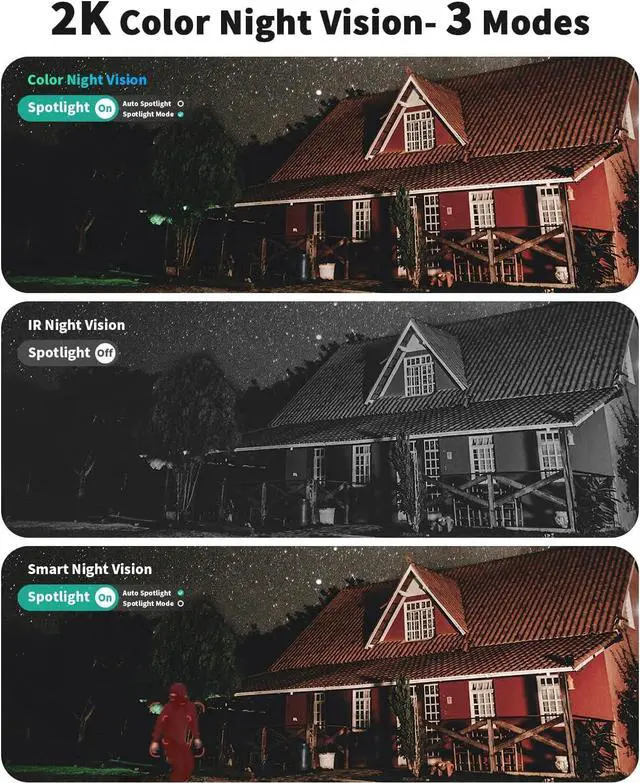 2K Color Night Vision & 360°Viewing: 4G security camera with spotlight support three night vision modes: infrared/color/smart night vision. With the built-in led light, it will turn on automatically when the alarm sounds at night, and the full-color video recording will be clearer and more vivid. The 4g camera has a wide view, enabling 360°viewing angle monitoring, and 2K high-definition images allow you to easily capture every detail of the surrounding environment