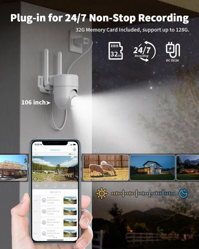 Non-Stop Recording: Wired cellular security camera support all-day non-stop recording. (No solar power. ) Equipped with a 2.7 -meter power cord, you can easily install lte security camera anywhere with power. The camera supports local memory cards storage (32G memory card included, up to 128G) and cloud storage. All-day recordings are stored on memory cards, and cloud storage only supports event recording